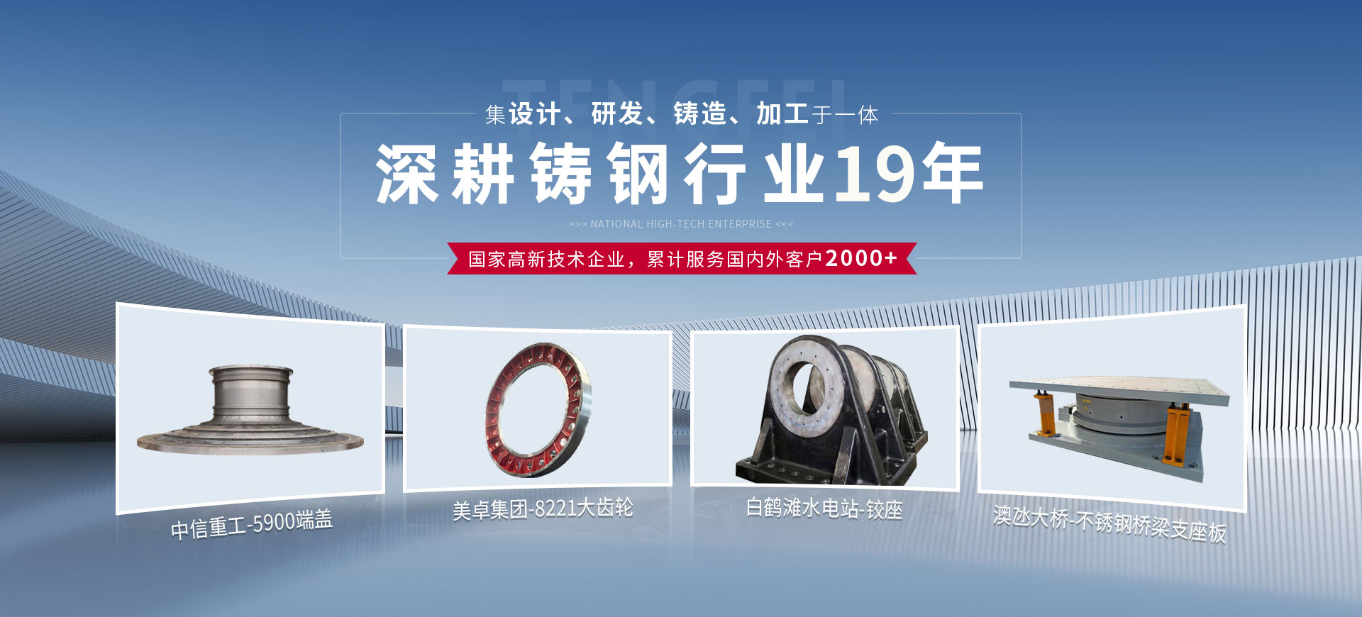 騰飛鑄鋼成立于2006年,位于全國鑄造基地河南省新鄉市,擁有員工300余人,是一家從事150噸以下碳鋼、低合金鋼、不銹鋼鑄鋼件研發、制造、服務為一體的國家高新技術企業?! 」就ㄟ^了ISO9001國際質量管理體系認證,擁有2項發明專 利,2項河南省科技成果、25項實用新型技術,通過了“環保績效評級B級企業”驗收,先后榮獲“河南省鑄造行業綠色發展企業”、 “河南省科技型中小企業”、“河南省專精特新中小企業”等榮譽稱號。  公司擁有2臺25噸電爐,4臺大型天燃氣熱處理爐、10米回旋自動拋丸機一臺, φ8m數控立車、φ10m數控滾齒機等各類高精裝備100余臺套,年產能3萬余噸,能為客戶提供從產品設計、木模加工、大型鑄造、大型加工一站式服務,產品廣泛應用于建材、冶金、鍛壓、冶金、水工、路橋、化工等多個重型行業?! ¢L期服務于中信重工、中船重工、美卓、上海中交、萊歇、寶武、濟南重工等全球知名企業,在行業內擁有較高的市場知名度和美譽度。
